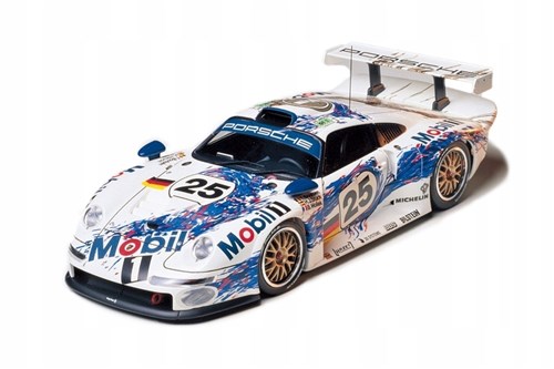 Tamiya her med et plastik byggesæt af Porsche 911 GT1 i skala 1:24. Dette sæt er en udstillingsmodel med et autentisk chassis og interiør, der kræver maling, limning og montering.