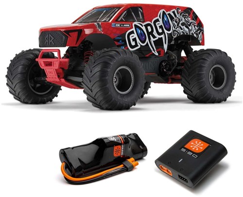 Arrma Gorgon Mega, her med børsteopsætning og tohjulstræk. Denne bil kan tåle meget og kan bruges hele året rundt, den leveres med al elektronik færdigmonteret i bilen og en ratradio med god rækkevidde og garanteret fri for forstyrrelser. Bilen er forsynet med et 8,4V NiMh batteri og en Spektrum S120 USB-C Smart oplader til dette, så her er alt klar til kørsel både på og uden for alfarvej. Bilen kommer med et monster truck karosseri og har god frihøjde og kort akselafstand. Bilen har også en meget holdbar drivlinje og spektrum 5 kg styreservo.