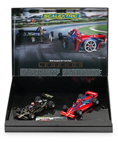 Dette er en banevognspakke med 2 biler fra Brabham og Lotus i skala 1:32. Bilerne er beregnet til brug på Scalextric analoge 1:32 bilbaner eller tilsvarende bilbanesystemer. Denne pakke er en Limited Edition og der laves kun 3.000 eksemplarer og leveres i en fin lille æske!