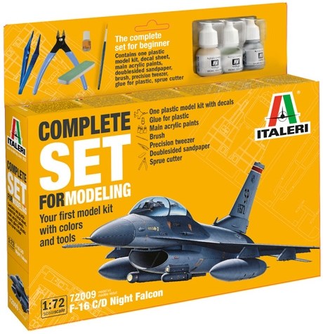 Byggesæt til F-16 C/D Night Falcon i skala 1:72, modellen leveres med to sæt mærkater, maling, limpincet, sandpapir og rester, helt komplet!