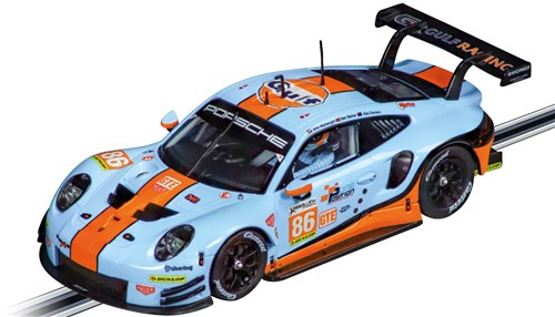 Carrera 1:32 Porsche 911 RSR Gulf Racing, Mike Wainwright, nr.86. Silverstone 2018. Analog racerbil i 1:32 skala kan bruges på Carrera Evolution bilbaner. Kan opgraderes til brug på et digitalt spor med en digital dekoder. Bilen er desuden udstyret med fungerende for- og baglygter!