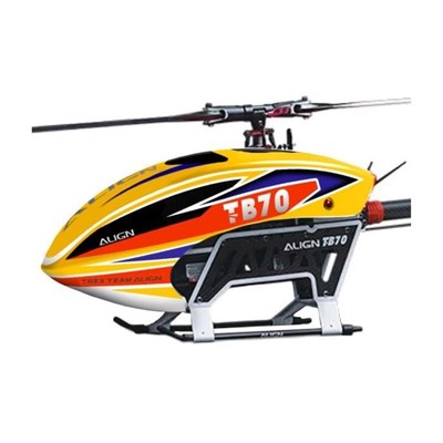 Align T-Rex TB70 V2 leveres her som et sæt med Aligns 800MX motor og klinger. Selve helikopteren leveres som byggesæt og kræver det nødvendige tilbehør som radiosender og modtager, esc, servoer, lader, batteri og værktøj.