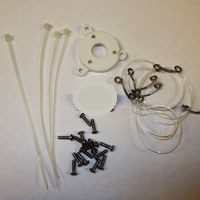 Tilbehørstaske til Cessna 182 flyder. Pakken indeholder skruer til flådene, metalbeslagene, plastmotorens monteringer, strimler, overføringsrør til vandrør og plastdelen, der fastgøres til næsebjælket på flyet.
