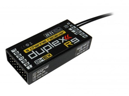 Jeti Duplex 2.4EX 9-kanals modtager med endeorienterede stikkontakter til din servo, satellit, batteri, sensor og USB-tilslutninger og dual 200 mm antenner.