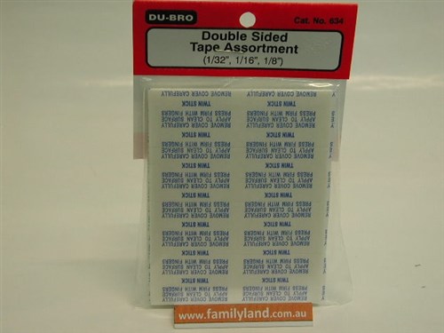 Du-Bros dobbeltsidet båndassortiment findes i 3 forskellige tykkelser: 1/32 (0,7 mm), 1/16 (1,5 mm), 1/8 (3 mm). Hver størrelse udføres med fire 1 (25 mm) x 3 (76 mm) stykker. (12 kvadrat inches) Fungerer godt til montering af servoer, modtagere, hastighedskontrol osv.