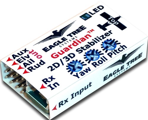 Based on Eagle Tree´s proven inertial stabilization technology, the Guardian 2D/3D Stabilizer is a must-have product for your model. The Guardian smoothes out air turbulence, but does much more. Unlike cheap ?gyro stabilizers," it provides true wing leveling capability to help recover from lost orientation!