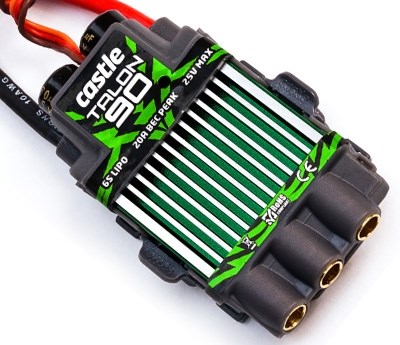 Meget kraftig kvalitetskontroller fra Castle Creations specielt designet til heli-brug. Controlleren er klar til at bruge lige ud af pakken, men giver dig en række ekstra muligheder for yderligere programmering. Talon 90 ESC har en BEC designet til nutidens servoer og pumper hele 20 amp toppen og 9 amp kontinuerligt, hvilket skulle gøre selv de mest magt hungrige servoer glade.
