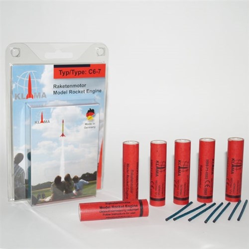 En pakke med seks raketmotorer og seks stænger til antændelse. Motorerne kan også antændes med elektroniske tænder. Motorerne er designet til brug i modelraketter.