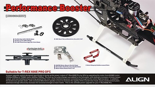 A power upgrade system designed specifically to bump up the power output of T-Rex 600E Pro by 30pst by upgrading the motor from 600MX motor (3300w/5500w) to 750MX/530KV motor (4400w/7260w). The feel as if a turbo charger was added to the helicopter, with dramatic increase of motor torque output, and near bulletproof governing speed of the rotor, while maintaining power consistency throughout the entire flight duration. In addition, the brand new spindle shaft design features enlarged diameter from 6mm to 8mm, with oversized M5x10mm spindle screws to increase the rigidity of the overall rotor head. This IS the ultimate power upgrade for your T-Rex 600E Pro.