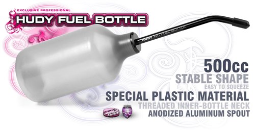 Stor brændstofflaske på 500cc med specielt blandet plastmateriale er let at presse, men vender let tilbage til sin oprindelige form. Den lange, sort-anodiserede aluminiumstud med buet hals er skruet ind i flaskehalsen, og den lufttætte gummihætte forhindrer spild. Glat, enkelt design.