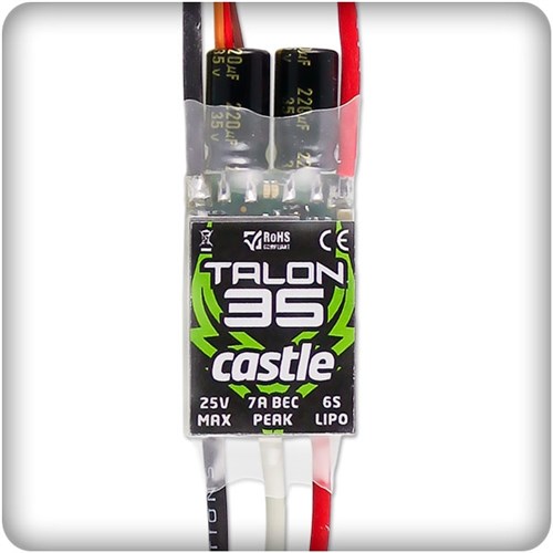 This "mighty mini" can take on the most extreme maneuvers while keeping it?s cool. Talon 35 is intended for use in 450 Heli setups running up to 6S or .10 to .20 fixed wing applications pulling up to 35 amps and boasts a 7 amp peak/5 amp continuous BEC, keeping even the most draining servos at ease. Talon 35 also offers Castle?s industry-leading helicopter functions, not to mention easy programming using the Castle Link USB adapter (coupon included). The compact layout and thin profile make mounting Talon 35 simple and stress-free in any setup.