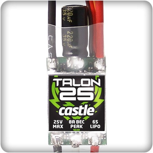 This compact controller can keep it?s cool even during the most extreme 3D maneuvers. Talon 25 is intended for use in most 400-size helicopter setups running up to 6S LiPo or your favorite 3D foamie that pulls up to 25 amps. Despite its size, it boasts an impressive 8 amp peak/3 amp continuous BEC, keeping even the most draining servos at ease. Talon 25 also offers Castle?s industry-leading helicopter functions, not to mention easy programming using the Castle Link USB adapter (coupon for free Castle Link included). Talon 25 tips the scales at a mere 18 grams!