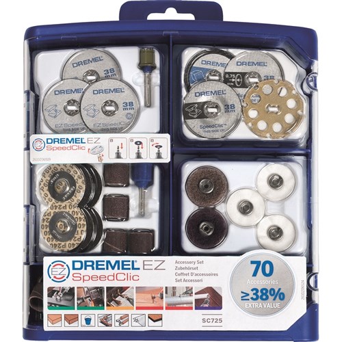 EZ SpeedClic universal tilbehørssæt indeholder 70 stk. originale EZ SpeedClic kvalitetsdele, der giver mulighed for hurtig og nem udskiftning af tilbehør uden behov for værktøj. EZ SpeedClic er Dremels unikke hurtigbyttesystem til roterende værktøjstilbehør. Med dette tilbehørssæt er du udstyret til mange forskellige opgaver, såsom skæring, polering, slibning og polering af mange forskellige materialer. Med opbevaringskassen ved du altid, hvor du har dit Dremel-tilbehør.