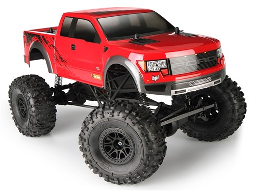 Durable Crawler King design Factory-assembled Ready-To-Run Unique Ford SVT Raptor body featuring custom digital mud design Full-time 4WD shaft drive HPI 2.4GHz radio system with pistol-grip radio Enclosed receiver box protects from the elements Forward-mounted battery for ideal weight distribution Real off-road truck suspension design Authentic straight-axle design Super-strong universal driveshafts HPI 55-turn crawling motor installed New spec LiPo-compatible SC-3SWP2 waterproof speed controller Battery box fits standard LiPo batteries & 6-cell NiMH Composite oil-filled threaded shock absorbers Grippy Championship-winning HB crawler tires Black 8-spoke beadlock style wheels Complete set of ball bearings Universal-fit body mounts allow huge range of optional bodies to fit Officially licensed, prepainted & detailed replica Ford SVT Raptor pick-up truck body