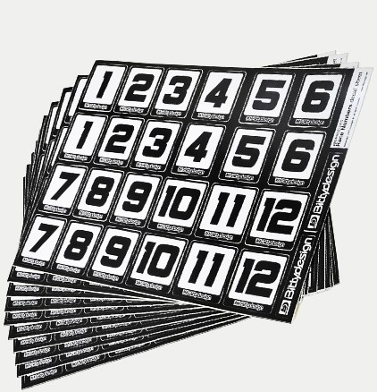 Nummerplader i top kvalitet til racing, præstanset. Hvert ark har 2 stykker af numrene 1-12, og pakken indeholder 5 ark - i alt 10 stykker af hvert nummer. Velegnet til både elektrisk og brændstof, tåler vask og rengøring.