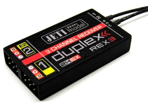 Jeti REX3, seneste generation af satellitmodtager. Jeti har stadig valgt at beholde det lille og kompakte design, men nu med i alt fire servo-porte. De ekstra porte er meget fleksible, de kan bruges som et eksempel til at forbinde telemetrisensorer.