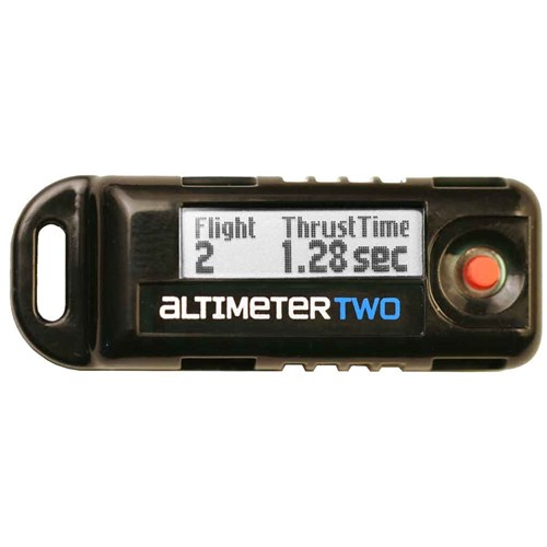 Perfekt værktøj til øjeblikkelig analyse af raketflyvning. AltimeterTwo er lille nok til at passe til de fleste raketter, og den måler 10 nøgleelementer i din flyvning, inklusive maksimal højde, tophastighed, trykvarighed, peak acceleration, starttid på skærmen og total flyvetid.