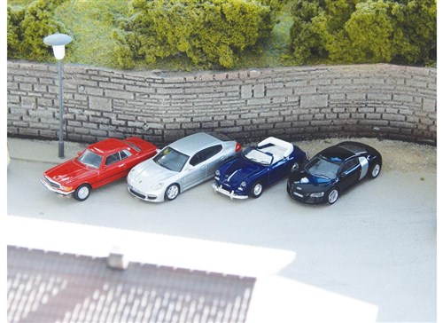 Pakke med fire detaljerede biler i skala 1:87. Gør omgivelserne på din jernbane mere realistiske ved at placere biler på veje, på stationer og butikker.