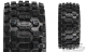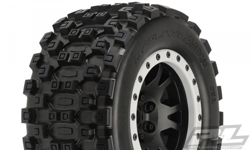 This is a pair of pre-mounted Badlands MX43 tires for X-MAXX. Pro-Line is ready to unleash the long-awaited tire solution for X-MAXX owners with the Biggest and Baddest tire and wheel combo ever conceived: the Badlands MX43 mounted on Impulse Wheels! Pro-Line Badlands tires are known for having a sweet Motocross inspired tread and the all-new Badlands MX43 tires kick that up a notch with a Bigger and Bolder knobby tread that matches modern MX tire design. These tires have been developed from the ground up for extreme X-MAXX punishment with an all-new ultra-durable compound that prevents tire ballooning even at high speeds. The Badlands MX43 features Pro-Lines ground breaking proprietary Pro-Loc Technology that creates an ultra-secure bond to Pro-Lines Impulse Pro-Loc X-MAXX wheels while still being removable when required. The Badlands MX43 is a true All-Terrain tire that will find traction on any surface but is best suited for loose & loamy dirt, mud or grass. Just imagine your X-MAXX throwing up huge rooster tails with these aggressive looking tires!