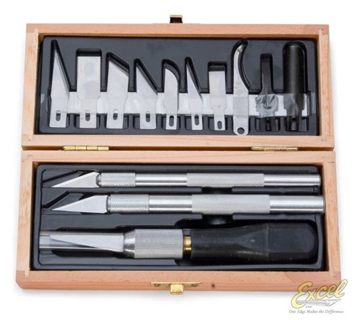 Set includes an assortment of superior quality knives and blades for cutting, trimming, carving, and chiseling of wood, plastic, rubber, and clay. Available in an attractive wooden box w/ molded trays that include a Teflon covered magnetic strip to help in holding the blades securely.