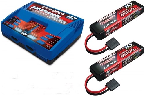 Denne pakke indeholder 1 oplader EZ-Peak Dual iD (2972G) og 2 stk Traxxas 3S 5000Mah LiPo-batterier med iD-stik (2872X) Perfekt pakke til E-Maxx, E-revo, XO-1, Spartan