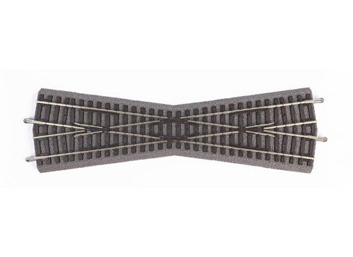 Kryds fra PIKO i H0 skala med underlag. Skinnerne er mere stabile og ser realistiske ud, mens de er lettere at samle. Det nye skinnesystem er kompatibelt med det gamle, men højdeforskellen skal udlignes, da fundamentet bygger et par millimeter.
