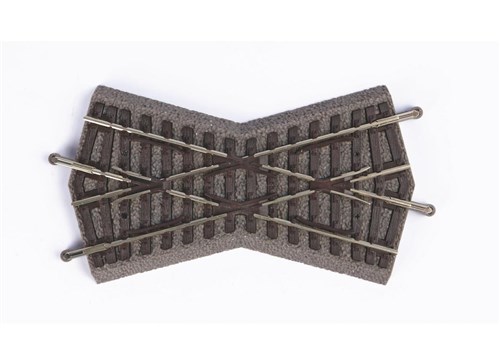 Kryds fra PIKO i H0 skala med underlag. Skinnerne er mere stabile og ser realistiske ud, mens de er lettere at samle. Det nye skinnesystem er kompatibelt med det gamle, men højdeforskellen skal udlignes, da fundamentet bygger et par millimeter.