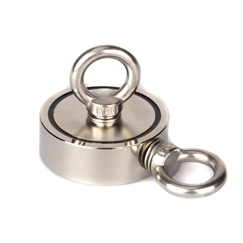 Supermagnet til magnetisk fiskeri med 250 kg løftekraft på hver side. Magneten har 2 kroge, der kan skrues eller slukkes efter ønske. Magneten er forniklet og leveres med en monteringskrog i rustfrit stål. Vi anbefaler at bruge reb fra 10-30 meter med en karabinhake i enden, gevindlim til kroge og handsker. Se under anbefalet tilbehør.