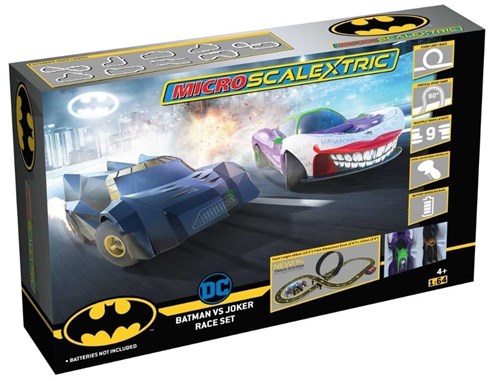 The Caped Crusader takes on the Clown Prince of Crime himself in this Batman vs Joker Micro Scalextric set. Featuring 2 x character cars modelled on Batman and the Joker, this set features 4.08metres of track, with 9 track layouts which includes a loop-the-loop and half pipe.