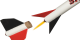 Thanks to the shape of the fins, this model is absolutely stable and nimble. The release of the first stage is very easy and thanks to the perforated centering rings, the gases are diverted so that the second stage can be safely ignited. The fins / wings made of milled plywood are very solid and are cleverly plugged into each other. The generous stickers complete the appearance of the model. Landing takes place using the parachute supplied.