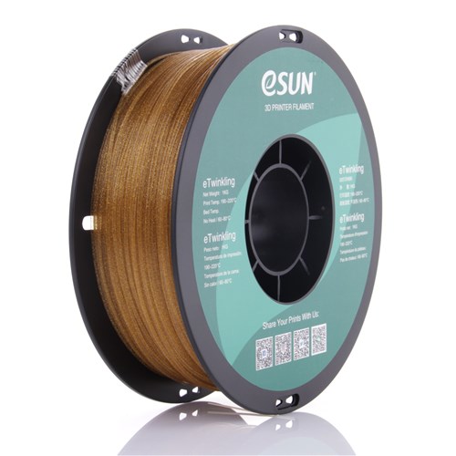 eTwinkling fra eSUN er PLA med tilføjet glitter for at få en metallisk effekt. Glødetråden er let at udskrive med og giver glatte og fine overflader, lille mulighed for krympning og lidt snor.