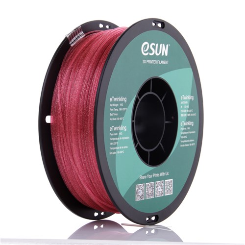 eTwinkling fra eSUN er PLA med tilføjet glitter for at få en metallisk effekt. Glødetråden er let at udskrive med og giver glatte og fine overflader, lille mulighed for krympning og lidt snor.