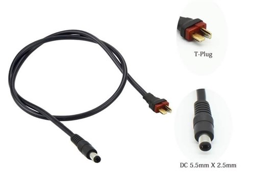 Sequre T-stik til DC5525 adapterkabel til brug af batterier med T-stik som strømkilde til loddeudstyr med DC5525-forbindelse.