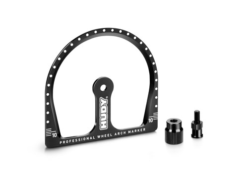 HUDY 1/10 TC Wheel Arch Marker er et CNC -bearbejdet værktøj til 1/10 biler. Hjælper med at finde det rigtige layout i forhold til hjulbrønde. Sættet indeholder hjuladapter og møtrik.