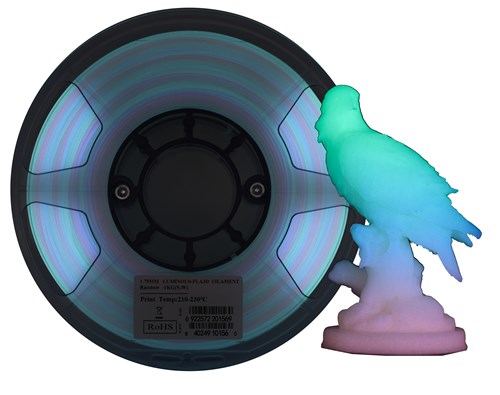 Lysende PLA fra eSUN med Rainbow -effekt, der giver en spændende farvekombination i mørket. PLA + fra eSUN er stærkere end almindelig PLA med bedre lagbinding. Normalt udskrives ved lidt højere temperaturer end almindelig PLA, men er lige så let at udskrive med. Filamentet giver glatte og fine overflader, ringe mulighed for svind og lidt snor.
