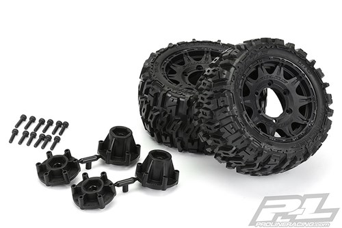 The Trencher LP 2.8" now comes conveniently Pre-Mounted on the next generation 2.8" wheel design from Pro-Line, the Raid 2.8" Removable Hex Wheel! Imagine being able to easily change the offset of your wheel to fit different applications by simply changing out the hex! You can go from the included 12mm narrow offset (2wd Stampede/Rustler Rear) to the included 12mm wide offset hexes (2wd Stampede®/Rustler® Front and 4x4 Stampede®/Rustler® Front and Rear) quickly and easily. Also imagine being able to replace a damaged wheel hex without needing to replace your glued tires (6335-00 Replacement Hexes) or even upgrading your wheels to 17mm wheel hexes (6336-00 Sold Separately) for extreme use! These new Raid 2.8" wheels accomplish all of this and more by using Pro-Lines unique 6x30 interlocking hex design that is secured to the wheel by 6 M3 screws that are spaced 30mm across. The built-in adjustability and ease of use make this a new must-have wheel for bashers everywhere!