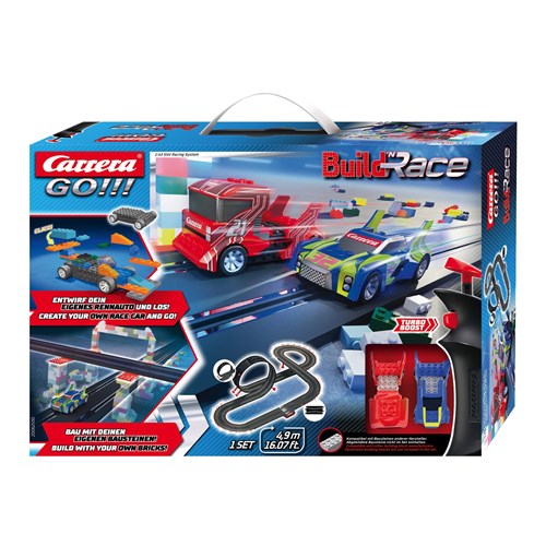 Build your way to victory with the new Carrera GO!!! Build n Race - Racing Set 4.9. Its not just engine power that decides the tense racetrack battles. These racing cars can be built at speed and rebuilt at will. Now you can use other manufacturers components to construct the race circuit environment of your dreams!