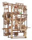 The model has a 3-stage alternating lift that hands the marbles back and forth as they climb to the top to embark on their amusement park adventures. Which marble will take which track, and which will make it down first? The Marble Run Stepped Hoist features a 3-marble accumulator in which the third ball opens the gates for the trapped first and second marbles, sending all three along their divergent paths. There are three tracks: the first consists of a 2-marble accumulator and serpentine run, the second is a hammer swing inside a C-shaped cradle, and the third has a whirlpool or funnel. All marbles eventually pass through the collection tray and into the seesaw lift. A rocker switch mechanism either sends the marbles back along the return track to the 3-stepped lift, or (and this is where it gets really exciting!) into another attached Ugears marble run.