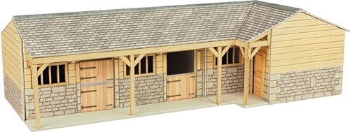 Stabil i imiteret træ og kampesten med mulighed for forskellige konfigurationer. Hjørnedelen kan enten være en stald eller et depotrum. Delene er laserskåret træ.