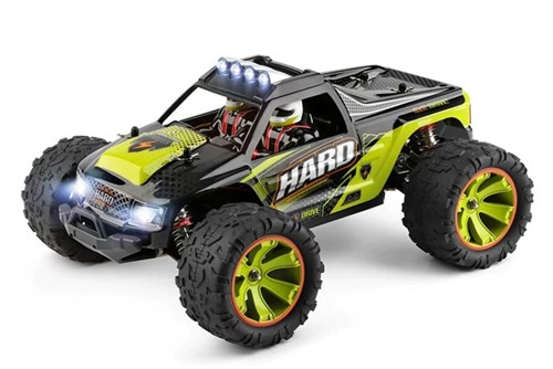 WLToys Hard Monster i 1/14 skala med 4WD. Fedt monster med meget brug af solide aluminiumsdele. Leveres komplet med genopladeligt LiPo-batteri og 2,4 GHz ratradio. Bilen er 31 cm lang og har en tophastighed på op til 45 km/t. Der medfølger en oplader, så det eneste der skal til herudover er 4 AA batterier til radioen.