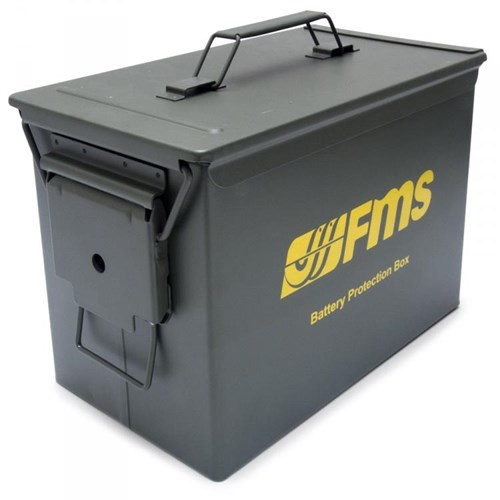 FMS Battery Protection Box er en metalboks beregnet til opbevaring af lipo-batterier. Æskerne er designet til at forhindre spredning af flammer, i tilfælde af brand i LiPo-batterier. Æskerne er lufttætte og indersiden er dækket af et gummimateriale for at holde den tæt og for bedre beskyttelse.