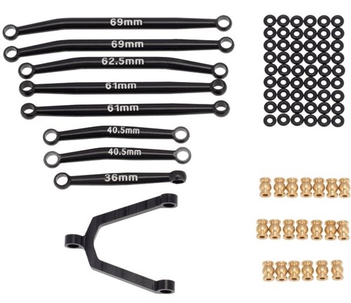 HobbyDetails Lowprofile Alu Shell SCX24 er et chassissæt i aluminium, der inkluderer trækstænger og styrestænger, der gør bilen lavere. Dette sæt passer til SCX24 90081.