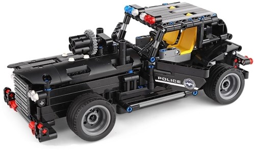 Med dette sæt bygger du din egen politibil, som endda er radiostyret. Sættet består af 464 byggeklodser fra Mould King, motormodul og radiosender.