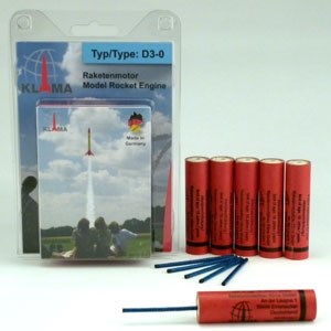 En pakke med seks raketmotorer og seks sikringer til tænding. Motorerne kan også tændes med en elektronisk tænder. Motorerne er tænkt som det første trin i flertrinsmodelraketter.