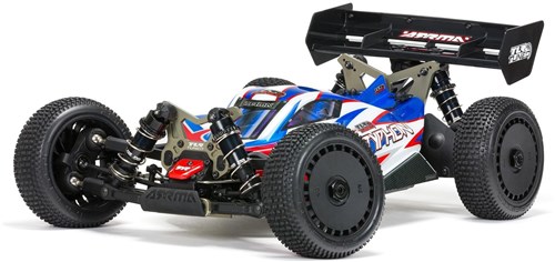 Arrma Typhon Buggy 4WD TLR 1/8 leveres her som RTR! Denne bil er en TLR tunet udgave af den populære Typhon BLX, her får du laserskårne aluminiumsdele og flere andre opgraderede dele. Bilen leveres færdigbygget med elektronik og er beregnet til brug af 4-6ere og en fin blanding mellem en bashing og 1/8 konkurrencebil.