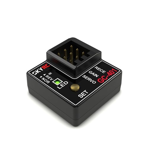 Gyro til biler, forbinder mellem modtager og styreservo. Gyroen vil hjælpe med at korrigere bevægelse af bilen, som ikke kommer som input fra senderen/chaufføren. GC-401 har tre køretilstande med forskellige følsomheder.