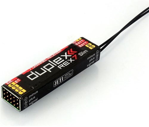 7-kanals fuld-range modtager, der er kompatibel med JETI EX og EX Bus protokoller. Understøtter telemetri. Dette er en slank version designet kompakt til at passe ind i smalle flykroppe.