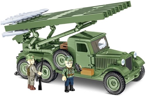 Byggesæt af BM-13 Katyusha Rocket Launcher, en sovjetfremstillet bil med en raketaffyringsrampe, her i skala 1:35. Sættet består af 440 dele og en cool raketkaster, 6 hjul og kommer med forskelligt stilfuldt tilbehør inklusive to figurer og et våben. Cobi klodser er kompatible med legoklodser.