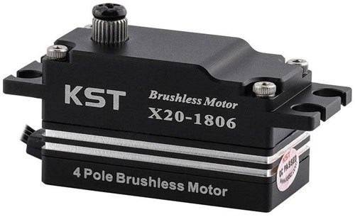 KST X20-1806 Low Profile Digital MG Servo er en meget hurtig, lavprofils og kraftig digital servo med stålgear, 4-polet børsteløs motor, aluminiumshus og 25T spline. Denne servo tager 6-8,4V ind og har evnen til at trække 18 kg ved 8,4V! Servoen vejer kun 50g og leveres med et lille udvalg af enkelte og dobbelte plastservohorn, et aluminiumshorn og diverse fastgørelsesskruer. Genialt til dem, der har lidt plads og har brug for en hurtig og kraftfuld servo i en buggy eller jetfly.