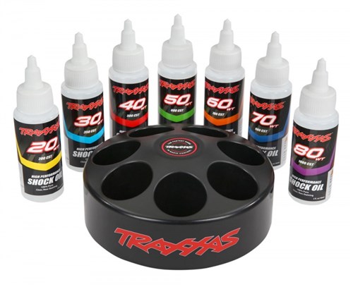 Traxxas her med en roterende oliebeholder og 7 flasker spjældolie med viskositet 20-80WT (200-1000cSt), Flaskerne indeholder hver 60ml og har alle plads i beholderen på samme tid. Det gør det endnu nemmere at holde hobbyrummet mere ryddeligt!